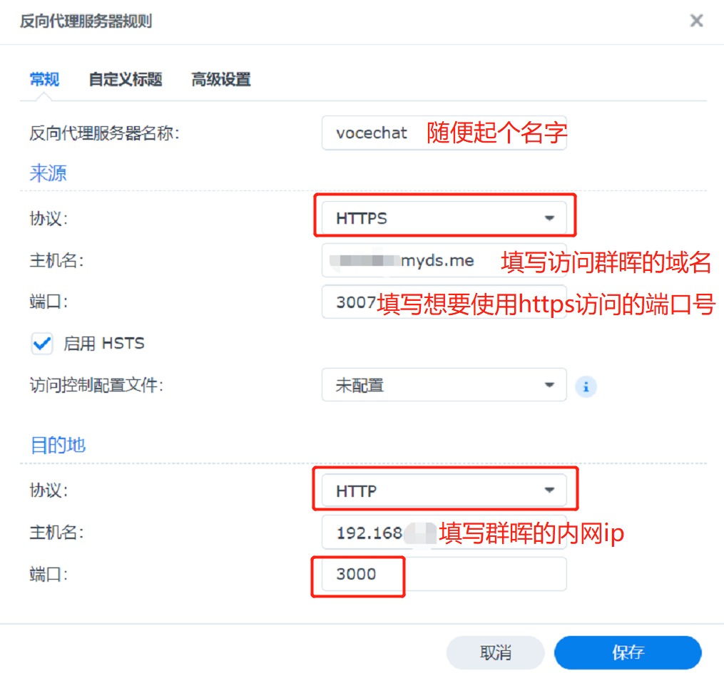 我们在外网访问时候,会先经过反向代理服务器,所以这里的来源要写自己访问的网址和端口号,而目的地当然就是我们的docker容器了,其中我们的容器是使用http访问的。也就是说反向代理服务器把https协议的3007端口在服务器内部转发到http协议的3000端口。