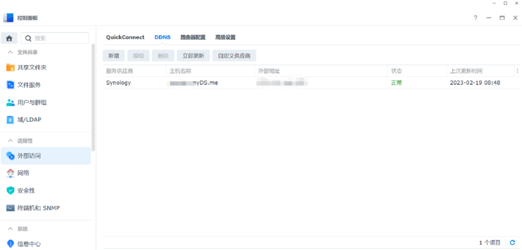 如果你是白群晖或是已经洗白的,可以在这里添加一个官方的ddns,如果是黑群也可以使用其它域名提供商的