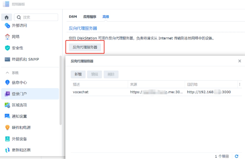 接下来进入控制面板-登录门户-高级-反向代理服务器
