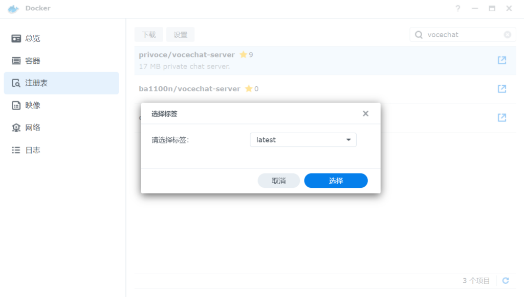 在群晖上安装好docker套件后,点击注册表,搜索并下载VoceChat