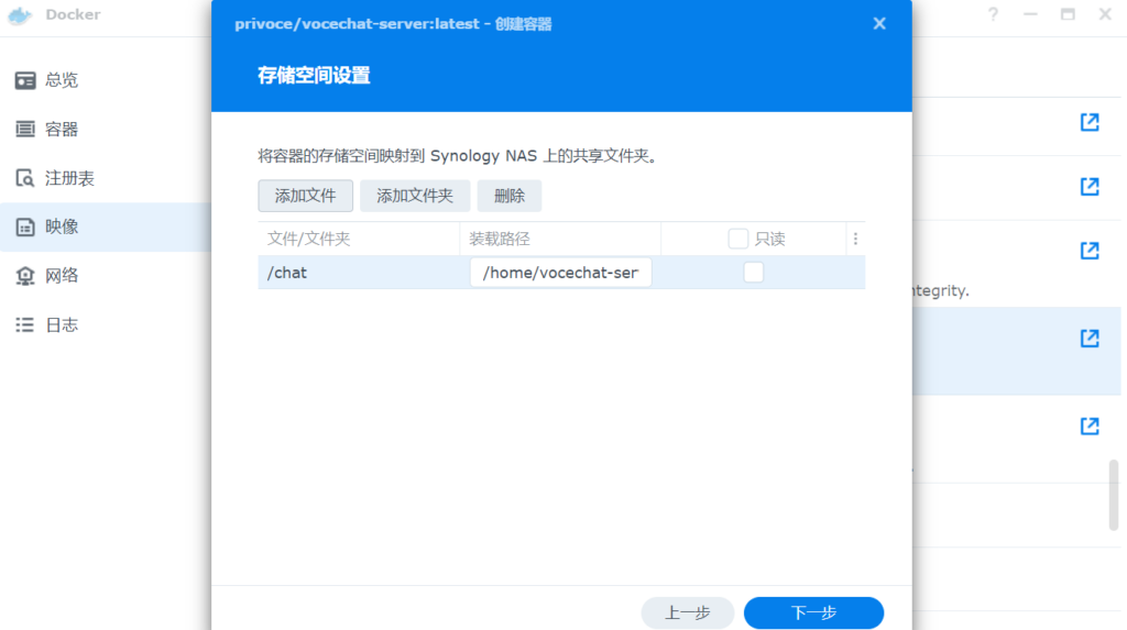 点击下一步后,可以在这里添加一个文件夹,装载路径填写:/home/vocechat-server/data